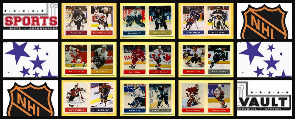 One of 2 licenses to make NHL hockey stickers for this year was given to Sports Vault (a Canadian company) and not to Panini. I first discovered these black sticker packages in the Game On Sports stores here in Edmonton, Alberta, Canada. The packages cost $1.69 each back in 2003. I bought a few packages to see what the stickers looked like and was pleasantly surprised. The stickers are very thin and feature 300 different players (8 players plus 2 team logos times 30 teams).