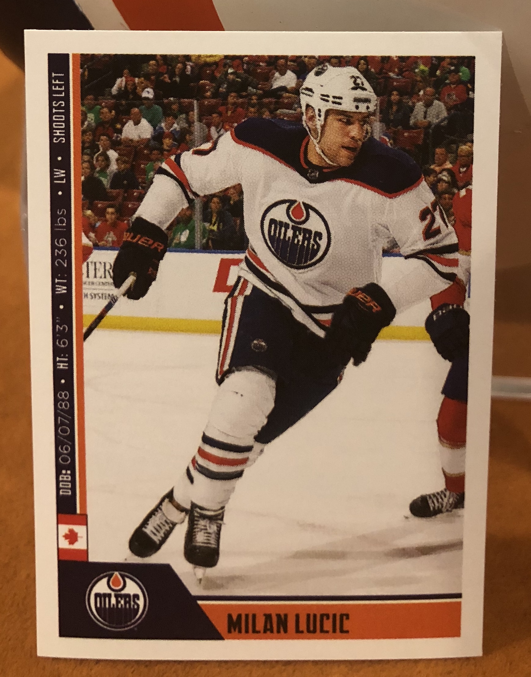 This sticker measures 4.9 X 6.9 cm (1.9 X 2.75 inches) which emulates the early 80’s classic size of sticker. This sticker is part of a massive five hundred and seventy five PANINI sticker set of NHL Hockey Stickers. There are also a large number of 141 Special Print Foils to chase in this set. It takes about 7-8 boxes on average to pull at least one of each sticker number in this set.