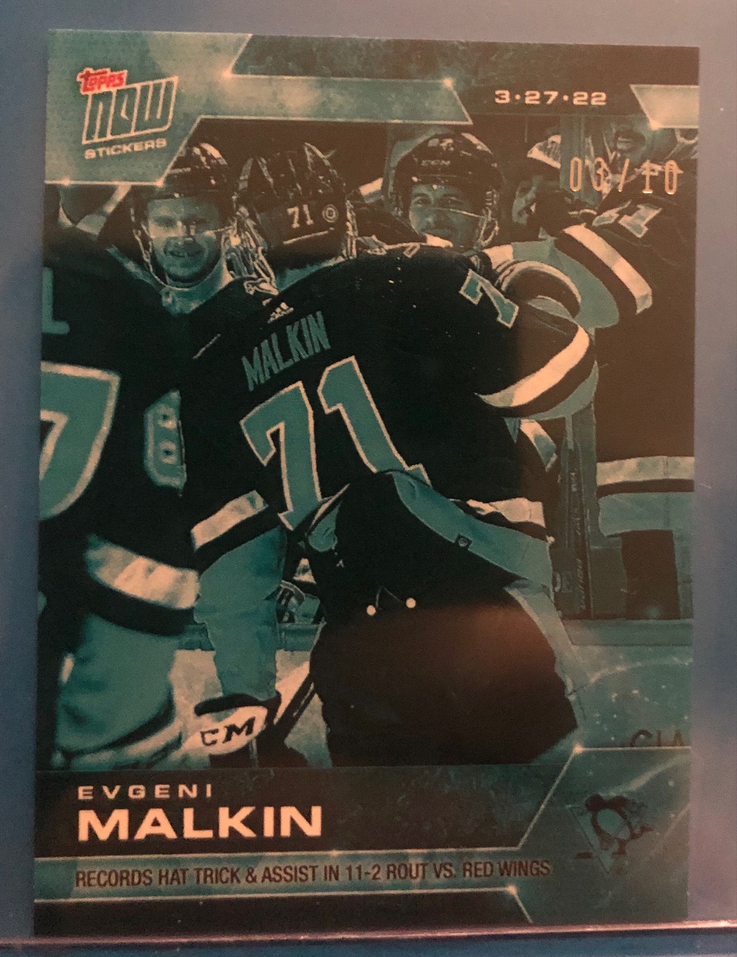 Records Hat Trick & Assist in 11-2 Rout vs. Red Wings. (3.27.22) from March 27, 2022. Penguins #3/10 is the sticker you will receive.