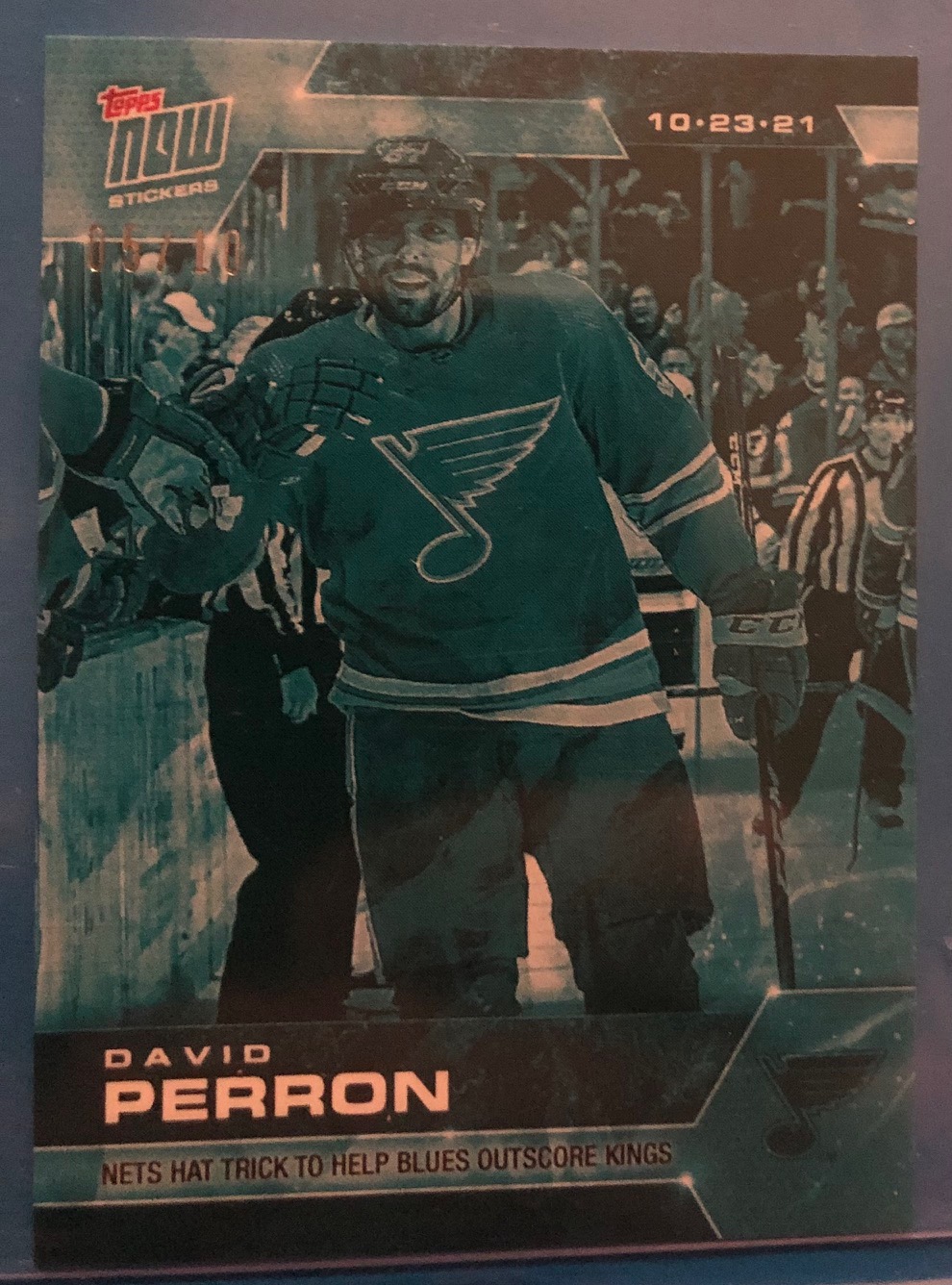 Nets Hat Trick to Help Blues Outscore Kings. (10.23.21) from October 23, 2021. Blues #5/10 is the sticker you will receive.